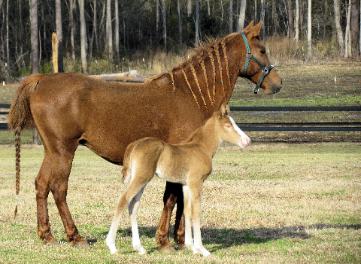 | Flash's Champagne Briella HS Gold Champagne Sabino Filly foaled February 26, 2013 out of Bonnies Twilight Lassie by Magics Golden Flash Registries include: NAHR, CHBOA, SMHA, RHBAA, NSSHA, SSHBEA, IPWHR, PSHR, & NWHA Here she is! Briella is a must have filly. She is naturally gaited. She has gorgeous gold coloring and she will captivate everyone with her awesome personality and breathtaking presence! Briella should mature around 16 hands. Briella is being offered for the pre-weanling price of $2,500. A $500 deposit will hold her until she is weaned on May 30, 2013. All weanlings lead, load, clip, stand for farrier and come with vet certification and coggins. |