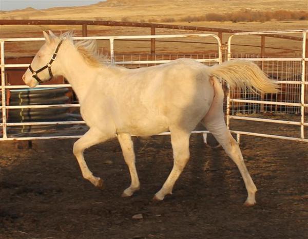 | Laredo's Knockout Girl Foaled April 6, 2011 TWHBEA #21100041 Perlino Filly with a strip, a left hind sock and a right hind fetlock Color Genetics: Ee/AA/CrCr Skye is a very talented filly. She has a very loose striding walk and an amazing head nod. She is all natural. Skye has great conformation and wonderful temperament to top it all off. This perlino filly is homozygous agouti, confirmed thru UC Davis. She will never produce a smoky black or smoky cream, no matter the color of the stallion. She will always pass her cream and one agouti onto her foals. She should mature to 15.0-15.2 hands. She is one great broodmare prospect or beautiful trail mare prospect. Skye has old time breeding. She goes back to Roy Roger's Trigger Jr. twice on her sire's side (Allen's Gold Zephyr). On her dam's side she goes back to the great horse The Pride Piper and Tennessee Goldust. We expect great things from this wonderful filly. She defiantly is the whole package. Skye is halter broke, leads and loads. She is weaned and ready to go to a new home. Both sire and dam are available on the ranch for viewing. Also Registered with TWHBEA Asking $3500 Krista Donsbach 9189 Hwy 59 South Miles City, MT 59301 Home: (406)421-5642 Cell: (406)939-3503 |